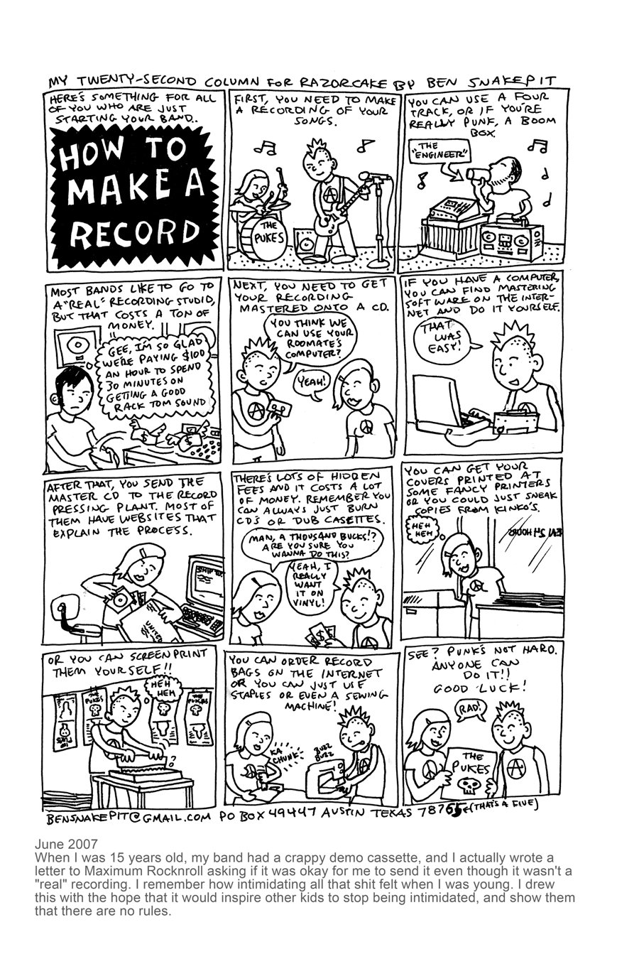 All of Ben Snakepit’s comics for Razorcake magazine, collected into one definitive volume! Spanning from 2003 until 2020, Snakepit covers the essentials of DIY punk life, from show reviews and scene reports, to the basics of touring on the cheap and making friends on the road, to falling in love and eating pizza he found face-down on the street. Offered with retrospective footnotes from the artist, this collection shows the growth and change of one punk’s perspective.